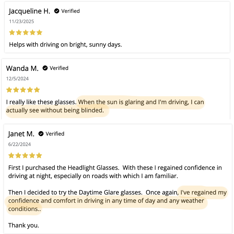 Been a confident driver since I was 17. Fourty years behind the wheel. Then LED headlights made me feel incompetent and scared. Stopped choir practice, stopped visiting my sister. These glasses brought back the driver I've always been.
